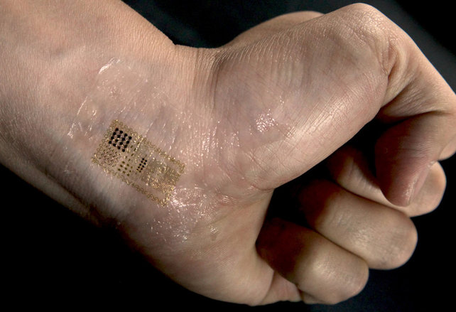 Er is namelijk door een onderzoeker genaamd John Rogers een product ontwikkeld dat op je huid geplakt kan worden door middel van een soort sticker. In deze sticker zitten een aantal technische componenten verwerkt zoals sensors en zenders waarmee de sticker informatie van jou kan verzamelen. Zie het als een soort Nike Fuelband die je op je huid plakt. De Fuelband kan namelijk aan de hand van een aantal sensors een heleboel nuttige data uitspuwen. Maar wat als je al deze bovenstaande ideeën combineert in één product?